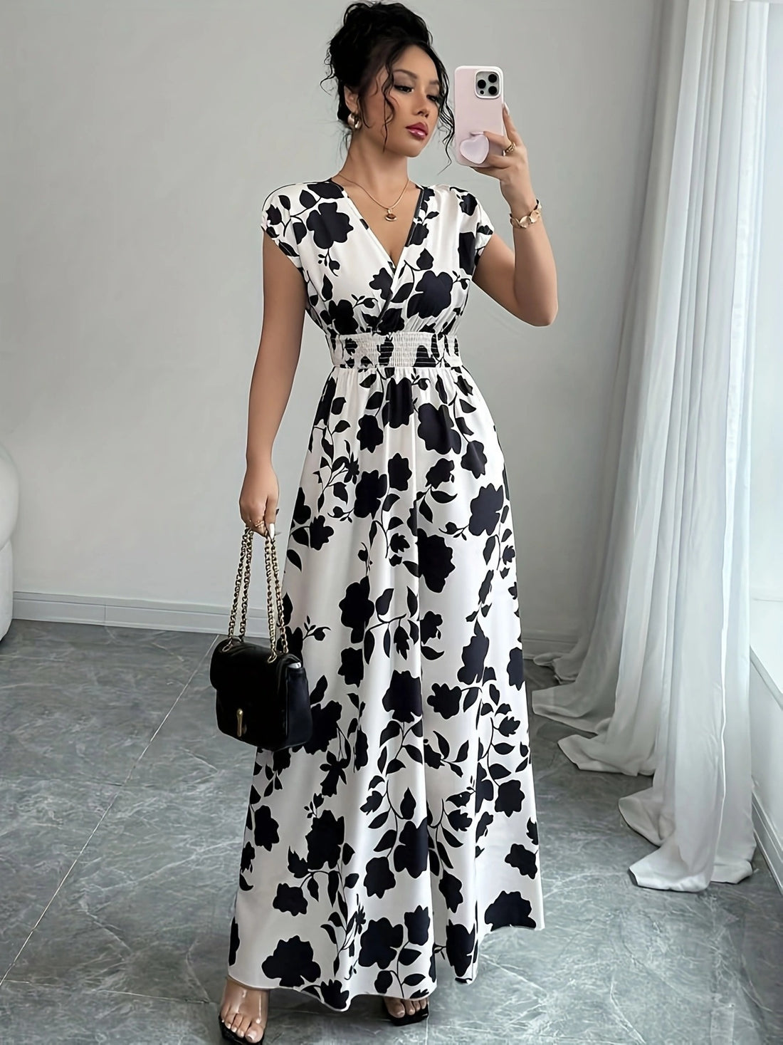 Stampa Floreale Classica Questo abito presenta un’elegante stampa floreale bianca e nera che crea un...