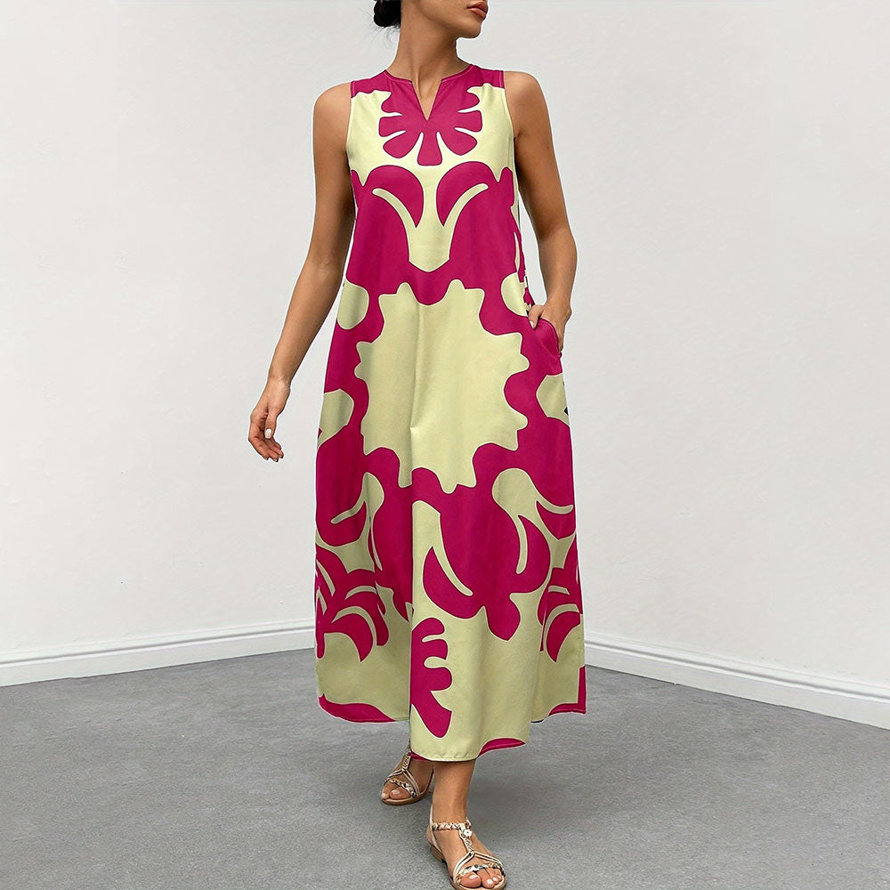 Il design senza maniche garantisce leggerezza e comfort, rendendo l’abito perfetto per le giornate calde e gli eventi estivi.